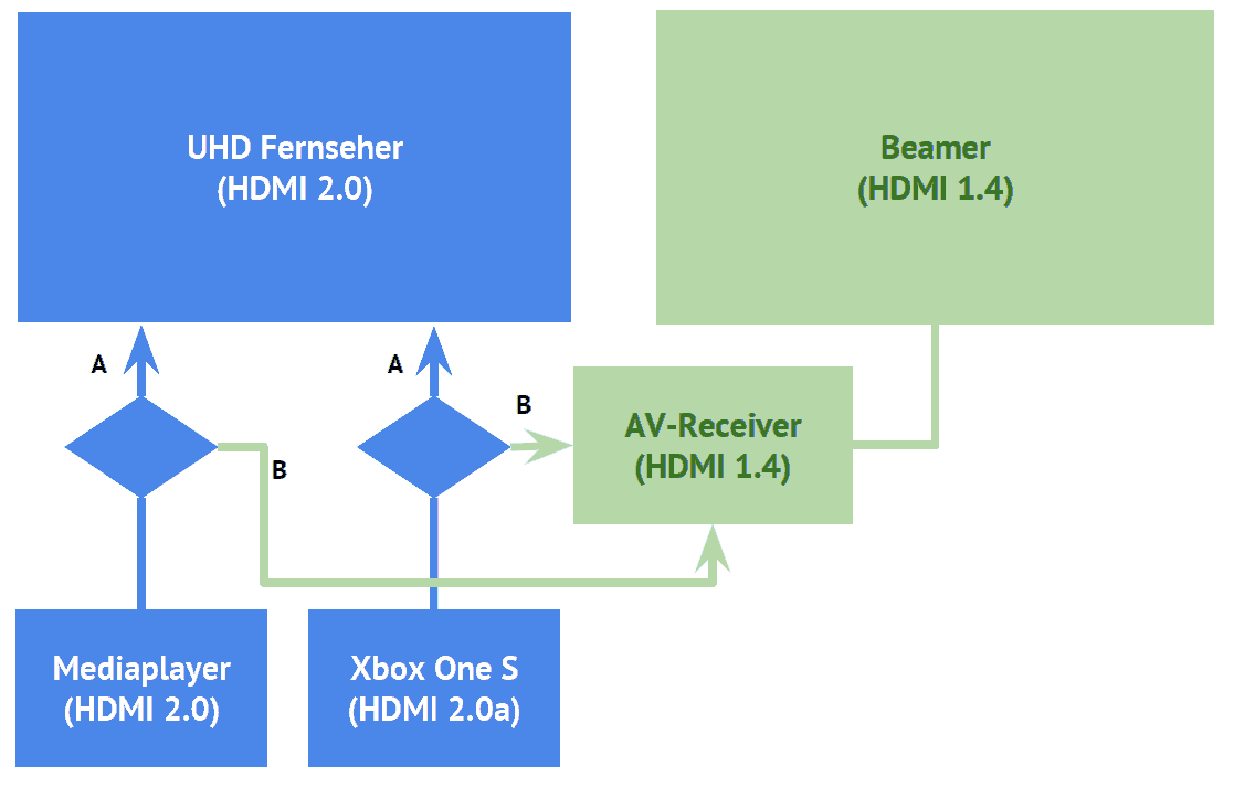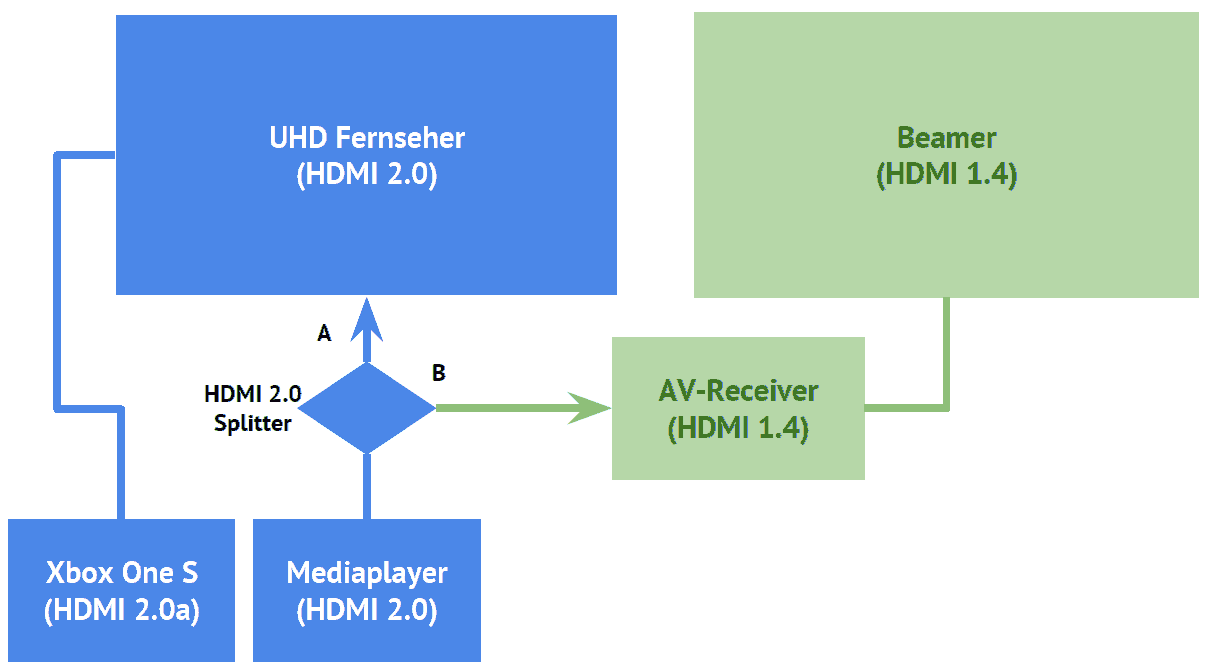 Der erste HDMI 2.0 Splitter verbindet die Xbox One S mit UHD Fernseher und Beamer (via AV-Receiver). Der zweite HDMI 2.0 Splitter verbindet ebenso den Mediaplayer mit dem UHD Fernseher und Beamer (via AV-Receiver).